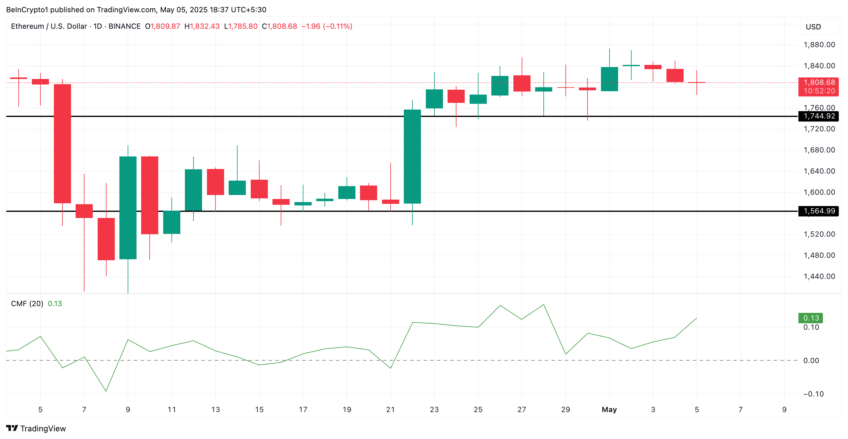 ETH handles til $1.808 i øjeblikket, og der er en stabil opbygning i bullish momentum. Dette afspejles i dens Chaikin Money Flow (CMF), som i øjeblikket ligger på 0,13 og er i en opadgående trend. En positiv CMF-aflæsning som denne indikerer en stigning i købspres. Hvis denne trend fortsætter, kan ETH stige til $2.072.