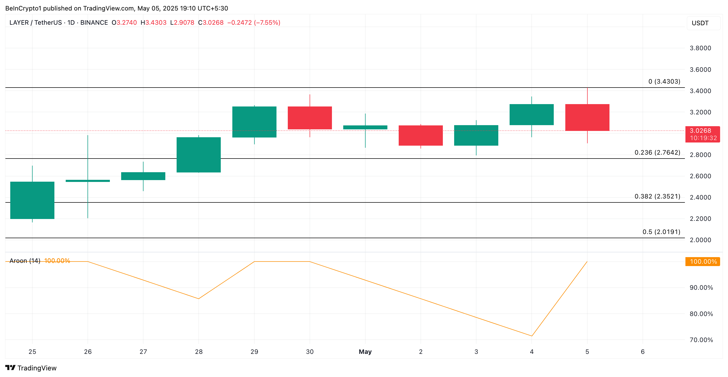 LAYER er steget med 14% i løbet af den seneste uge til at handle til $3,02 i øjeblikket. En vurdering af LAYER/USD en-dags diagrammet viser tokenets Aroon Up Line på 100%. Dette indikerer, at dens nuværende opadgående trend er stærk, understøttet af betydelig efterspørgsel efter altcoinen.