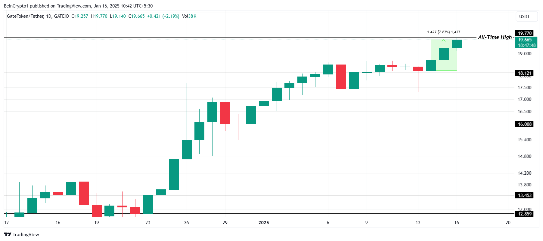 GT opretholdt sit bullish momentum og nåede en ny all-time high (ATH) på $19,77 inden for de sidste 24 timer. Denne vedvarende opadgående trend fremhæver voksende markedsinteresse og altcoinens evne til at opretholde sin præstation.