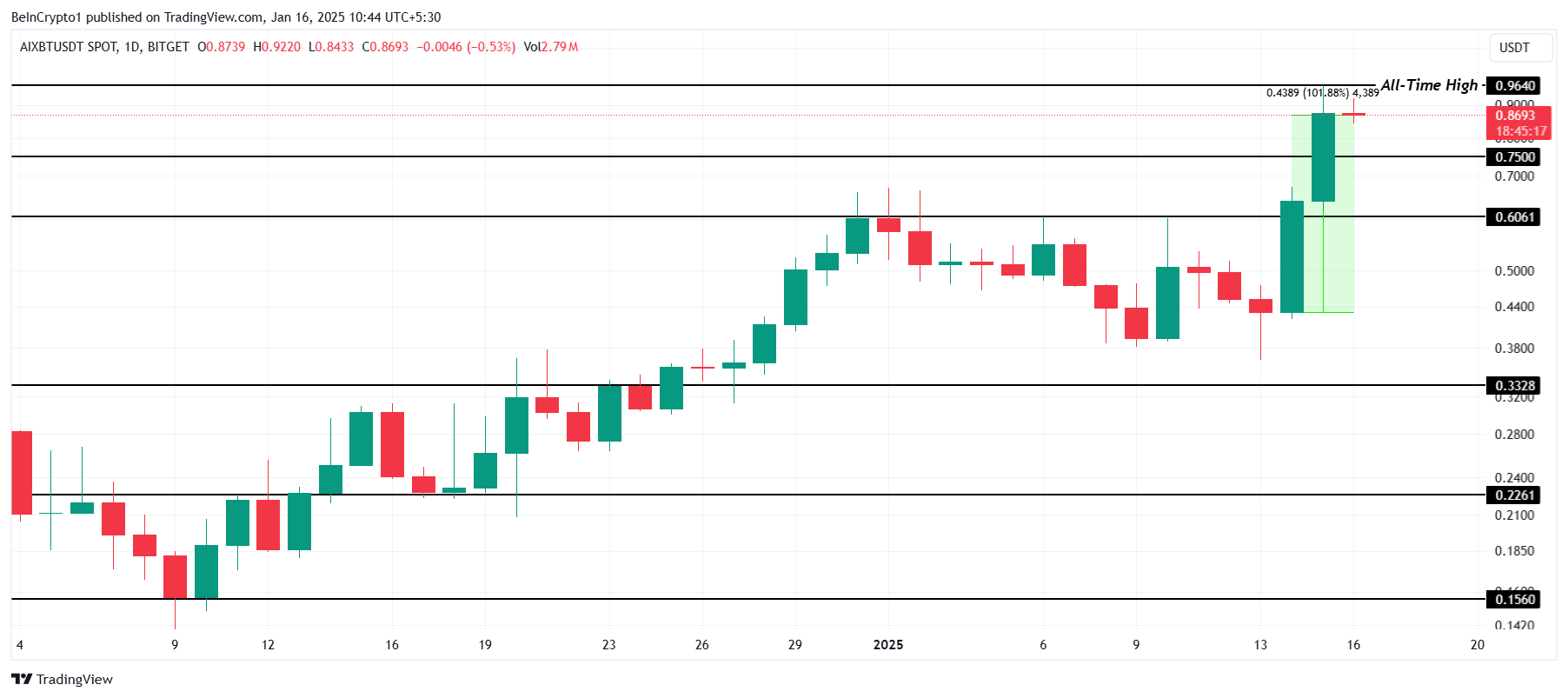 Under intra-dagshøjder nåede AIXBT en ny all-time high (ATH) på $0,96, drevet af stigende efterspørgsel efter dens AI Agent token. Hvis dette momentum fortsætter, kan altcoinen bryde $1,00 barrieren, hvilket yderligere styrker dens bullish trend.