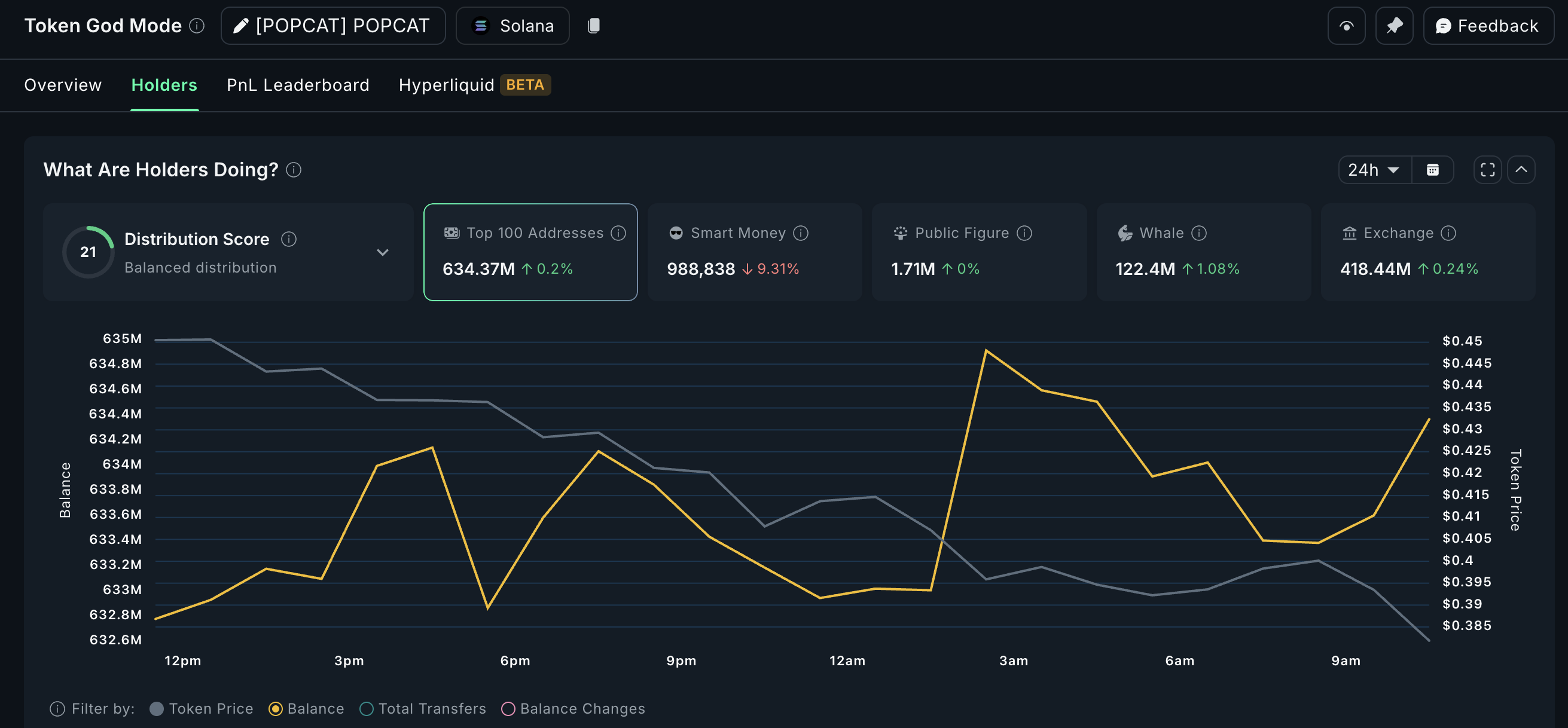 Popcat (POPCAT) er en anden Solana-baseret meme token, der har fanget handlendes interesse, og kryptohvaler holder tydeligvis øje. I løbet af de sidste 24 timer er hval-wallets der holder POPCAT steget 1,96%, hvilket bringer de samlede beholdninger til 82,4 millioner tokens.