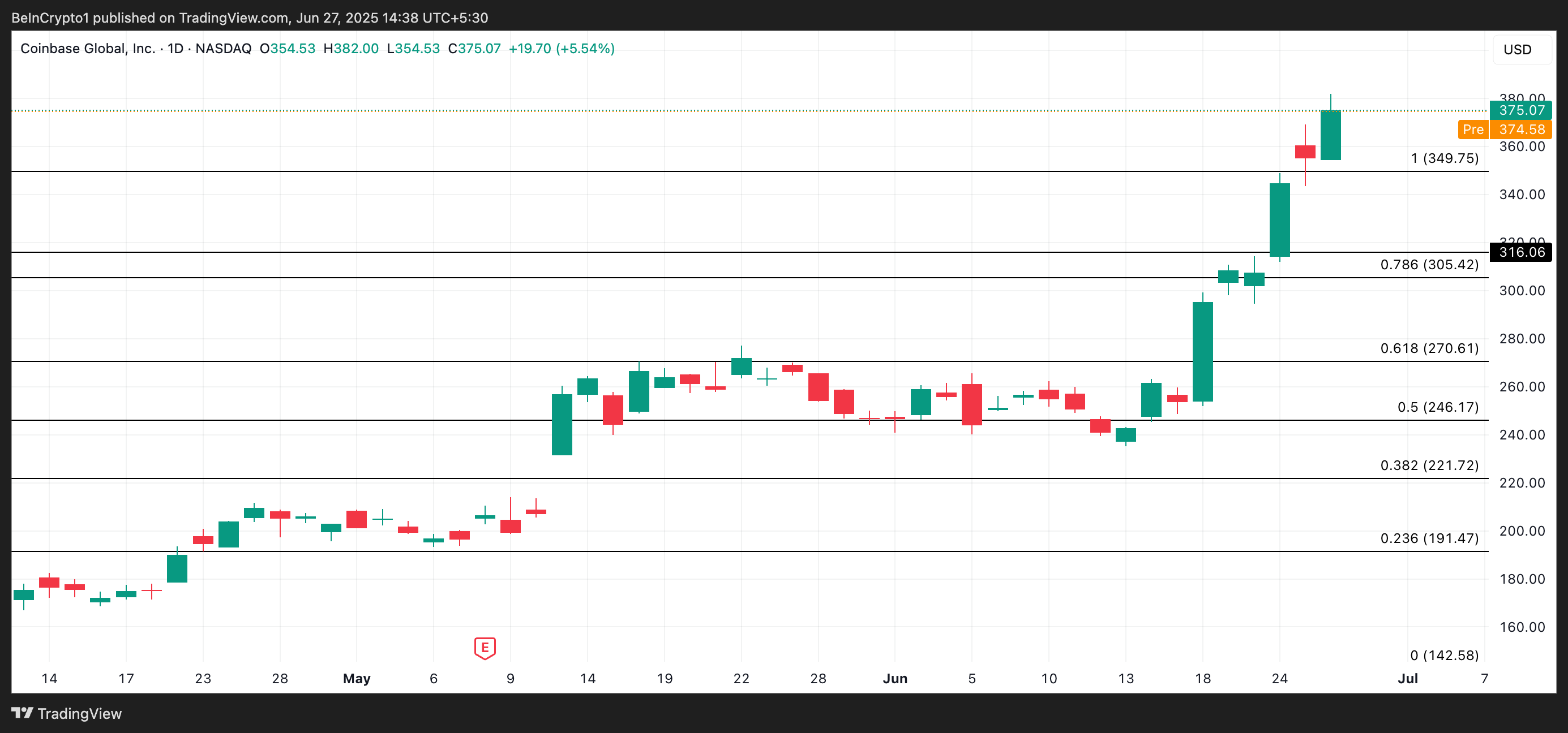 Bemærkelsesværdigt nåede COIN en ny rekordhøj på $382 under gårsdagens handelssession, hvilket afspejler stærkt bullish momentum omkring aktierne.