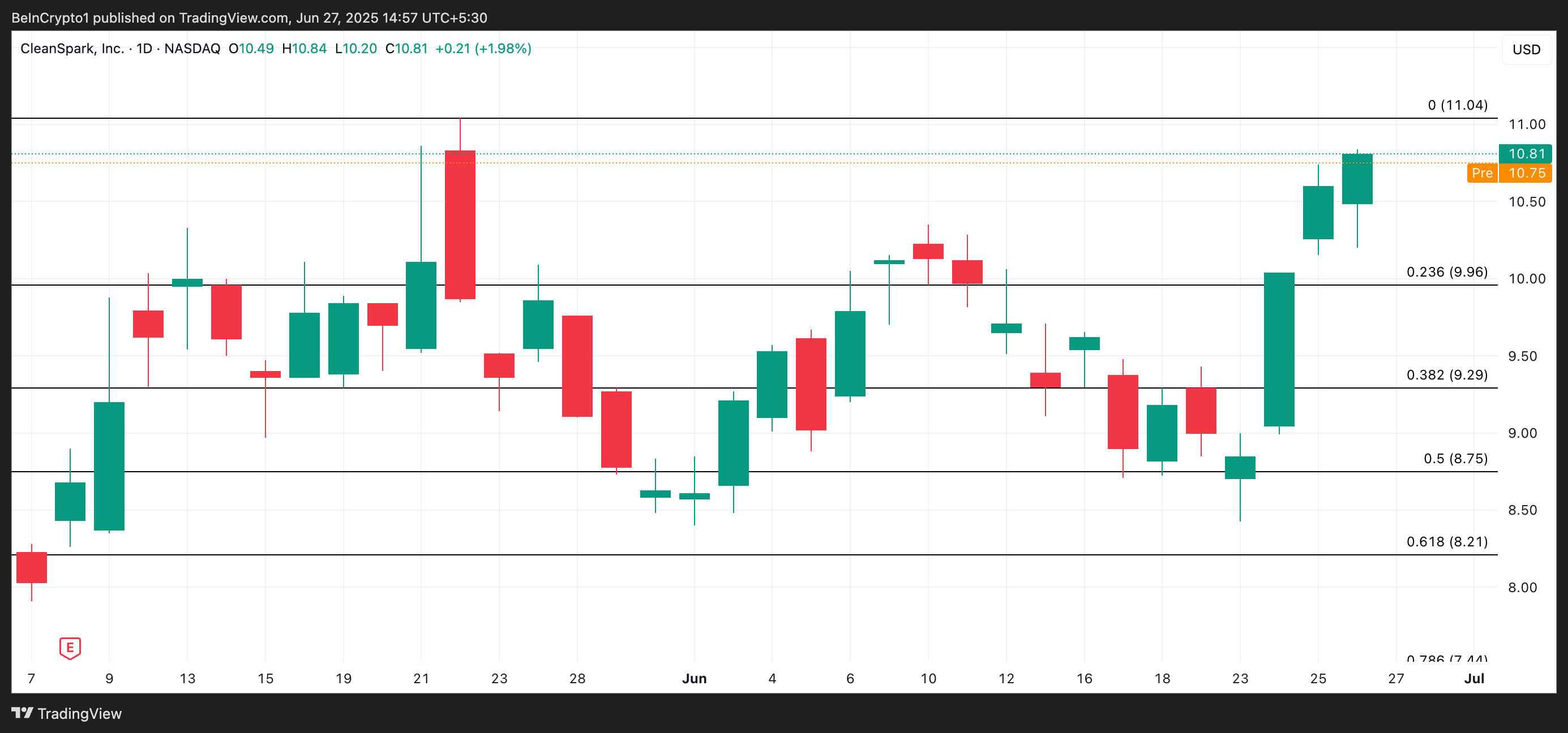 Den 24. juni annoncerede CleanSpark, at de med succes havde nået deres midtårsmål på 50 exahashes per sekund (EH/s) i operationel hashrate. Aktien lukkede i går på $10,81, op 0,94%, og handles i øjeblikket til $10,75 i førmarkedstimerne.