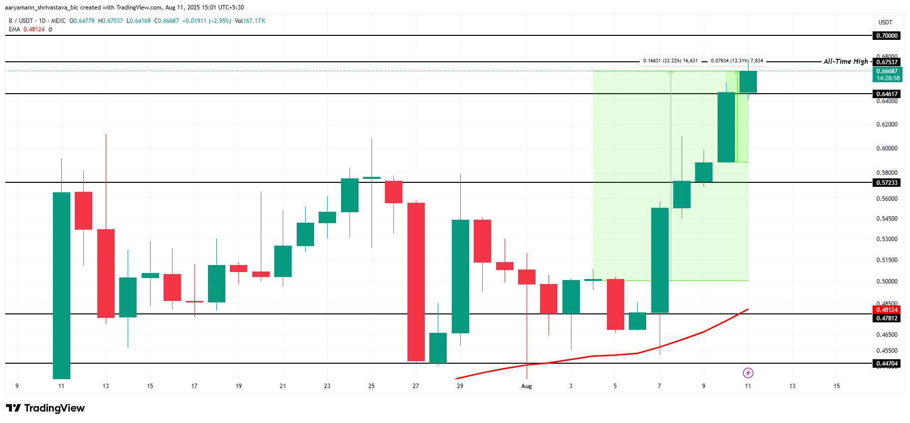 BUILDon har oplevet en bemærkelsesværdig stigning på 33% i den forgangne uge, med en 13% stigning i de sidste 24 timer. Meme coinen satte for nylig en ny all-time high (ATH) på $0.675, hvilket afspejler stærkt markedsmomentum. Dette udbrud signalerer potentialet for yderligere kursstigninger, hvis den bullish trend fortsætter.
