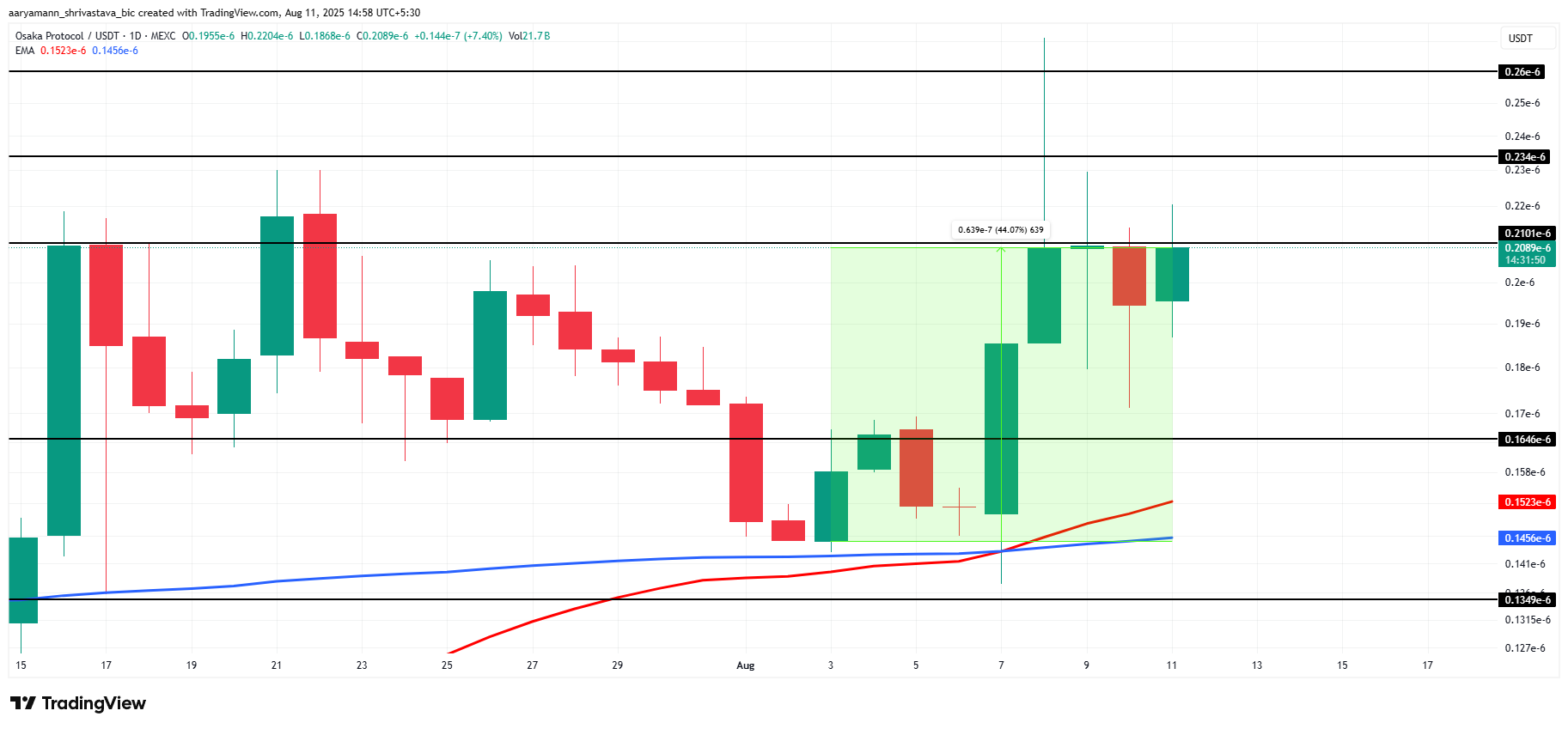 • Osaka Protocols Golden Cross antyder en stigning forbi $0.000000210, muligvis nå $0.000000234.
