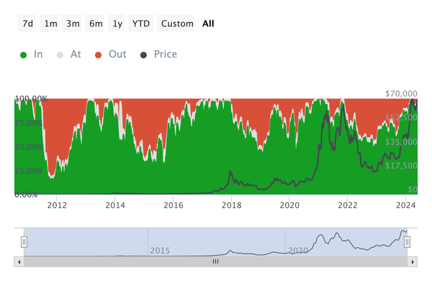 For eksempel er over 90% af Bitcoin-investorerne år til dato ‘In the Money’, hvilket betyder, at de tjener på deres beholdning. Historisk set er markedet vendt efter en lang periode med så massiv profit.