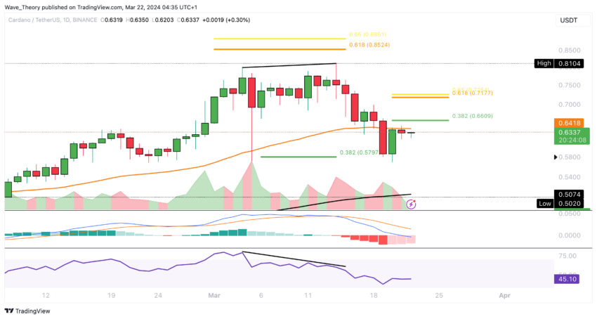 ADA-prisen oplevede en korrektion fra ca. $0,81 til omkring $0,57, udløst af en bearish divergens i Relative Strength Index (RSI). Cardano fandt støtte ved 0,382 Fibonacci-niveauet, ca. 0,58 $, og møder nu betydelig modstand ved 50-dages EMA, ca. 0,64 $.