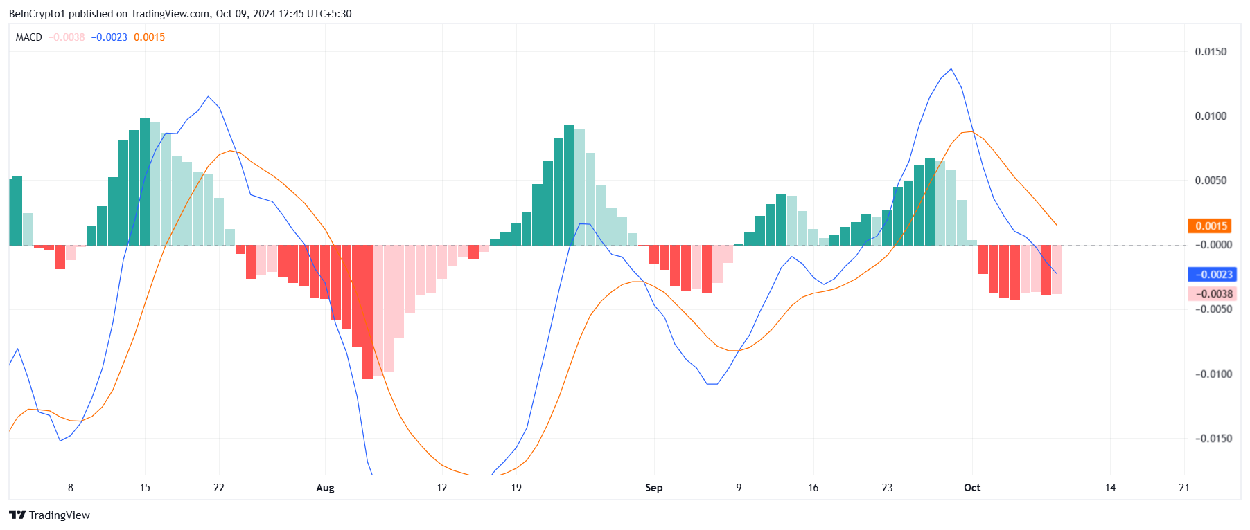 Set fra et makroperspektiv står Cardano stadig over for bearish pres, som indikeret af tekniske indikatorer såsom Moving Average Convergence Divergence (MACD). MACD’s histogram viser stadig røde bjælker, hvilket antyder, at bearish tendensen fortsætter, og en fuld genopretning er endnu ikke i gang. For en vellykket vending i Cardanos kurs, skal disse røde bjælker skifte til grønne, hvilket signalerer, at bullish momentum er vendt tilbage til markedet.