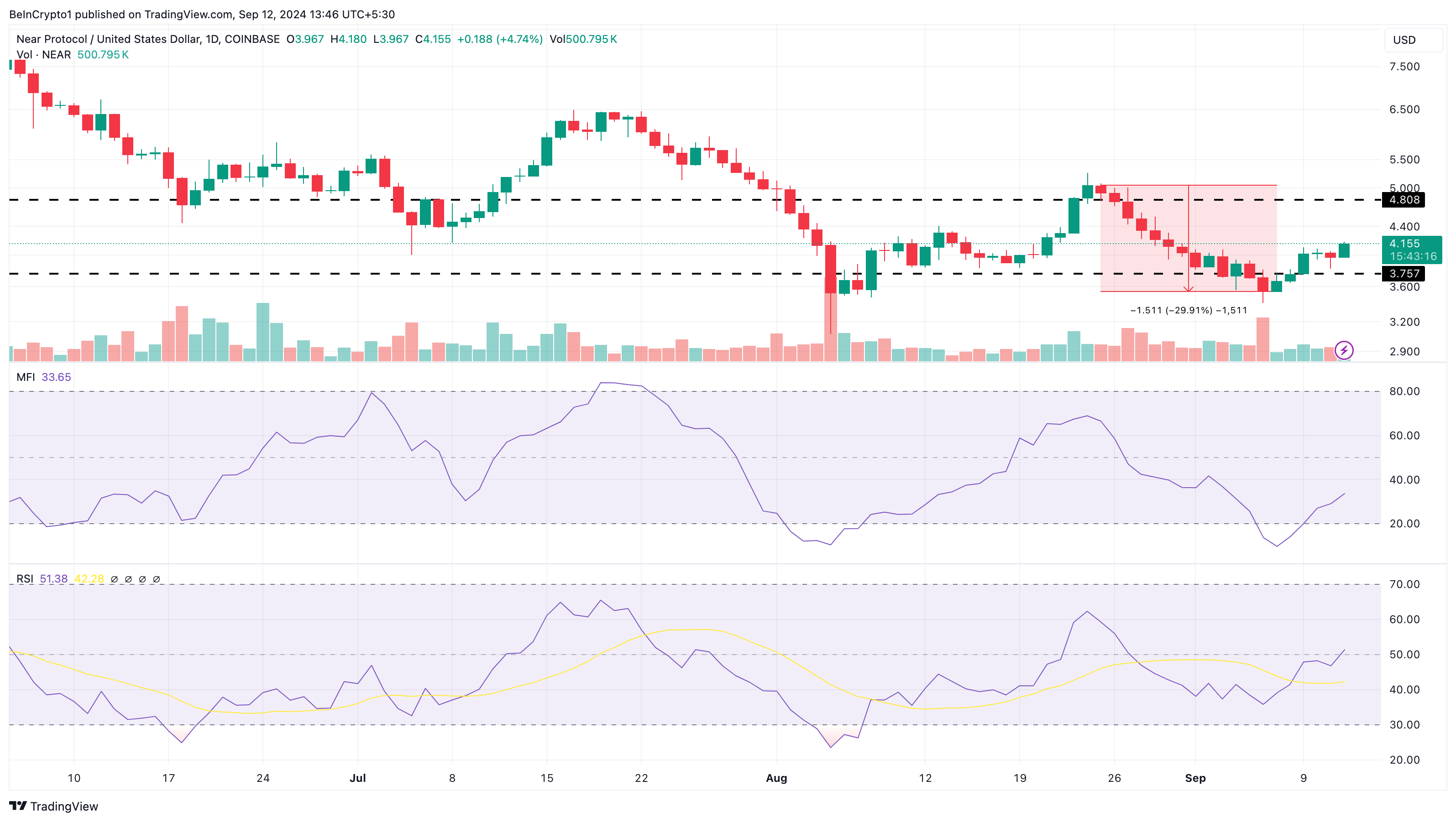 NEARs tekniske opsætning ligner FETs, da opsvinget begyndte omkring samme tid. I øjeblikket handles altcoinen til 4,15 dollars. Før det tabte NEAR næsten 30% af sin værdi, da den faldt fra 5,50 til 3,50 dollars.