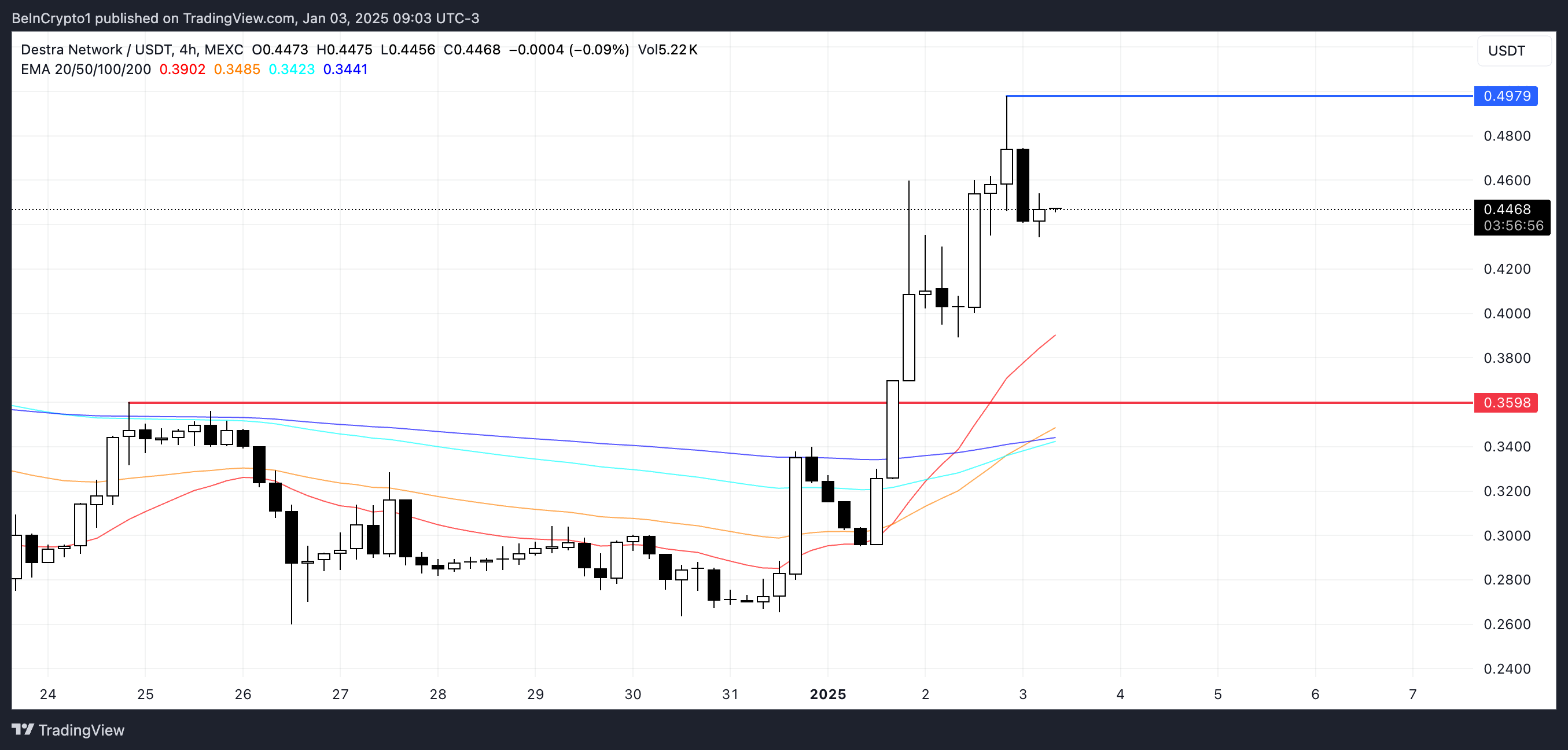 Hvis den opadgående trend fortsætter, kan DSYNC teste modstanden ved $0,497 og $0,5. Den kan potentielt stige til $0,55 og $0,6 for at nå nye rekordhøjder. Men hvis stigningen mister momentum, kan tokenet trække sig tilbage til sin støtte ved $0,359, hvilket signalerer en skarp korrektion.
