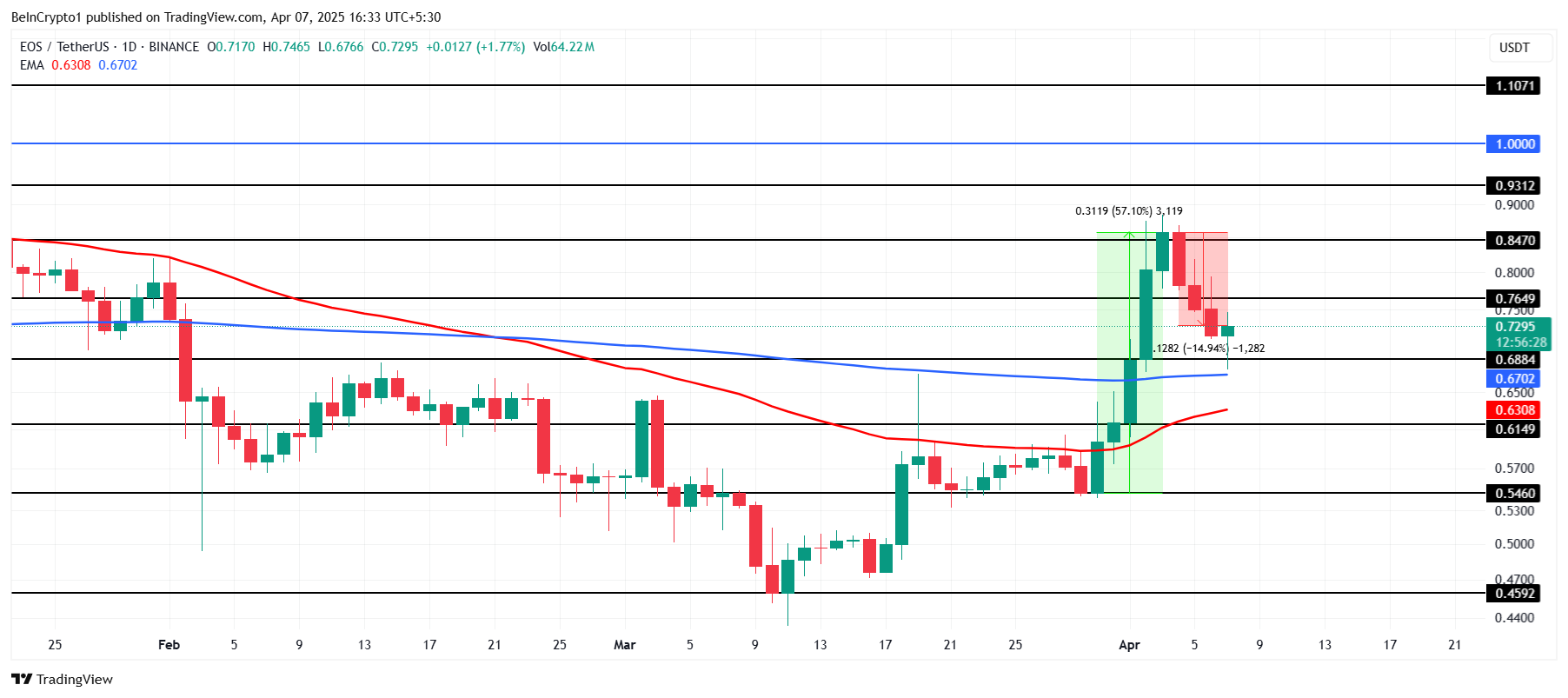 Hvis EOS ikke formår at opretholde støtten på $0,68, kan den falde til det næste støtteniveau på $0,61. At miste dette niveau ville afvise den bullish udsigt og slette de seneste gevinster, hvilket signalerer yderligere udfordringer for altcoinen.