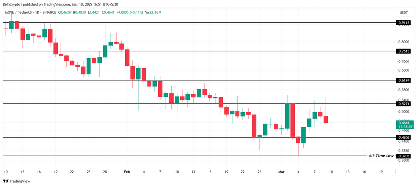 I øjeblikket handles MOVE til $0.464, og konsoliderer under modstanden på $0.527, mens den holder sig over støtten på $0.420. Hvis det bullish momentum bygger sig op, kan altcoinen stige mod $0.617. En vellykket brud på dette niveau ville bekræfte opsvinget og tiltrække fornyet investor-tillid.