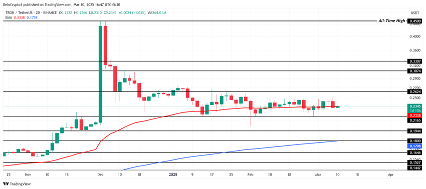 I øjeblikket konsoliderer Tron mellem $0.262 og $0.216, hvilket effektivt forhindrer store tab. Altcoinen ser ud til at være klar til at sikre sin 50-dages Exponential Moving Average (EMA) som støtte. Hvis det lykkes, kan dette tjene som en base for et udbrud, der tillader TRX at bevæge sig ud over sit etablerede interval og ind i en bullish fase.