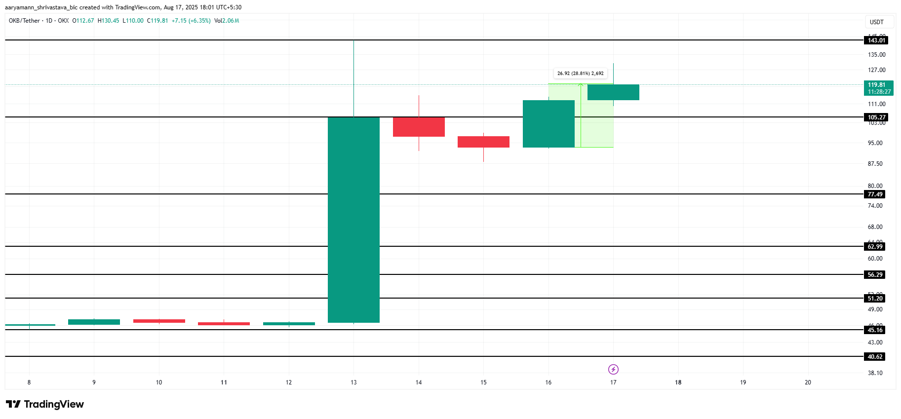 Inden for de sidste 24 timer steg OKB-kursen 28% og nåede $119 i skrivende stund. Hvis dette bullish momentum holder, kan altcoinen avancere mod $143 eller endda højere niveauer. En sådan bevægelse ville markere fornyet investorfortrøstning.