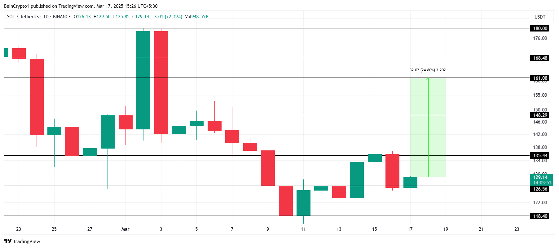 Solanas kurs er i øjeblikket $129 og positionerer sig for et potentielt bullish udbrud. Den 17. marts vil Chicago Mercantile Exchange (CME) lancere SOL Futures, en betydelig begivenhed for altcoinen. Da CME er en af de største derivatbørser globalt, kan dette føre til betydelige institutionelle inflows i Solana.