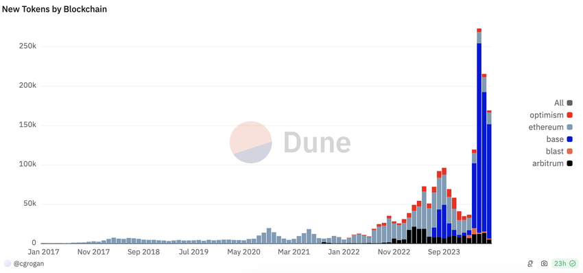 “Der blev oprettet næsten 1 million nye kryptotokens i den sidste måned, et tal, der er 2x det samlede antal, der nogensinde er lavet på Ethereum fra 2015-2023,” sagde Coinbase-direktør Conor Grogan.