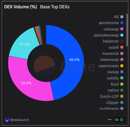 Siden Coinbase integrerede Aerodrome’s decentrale børs (DEX) i sin hovedapp, håndterer Aerodrome nu 48,3% af DEX-volumen på Base. Det har endda overgået store navne som Uniswap og Pancakeswap.