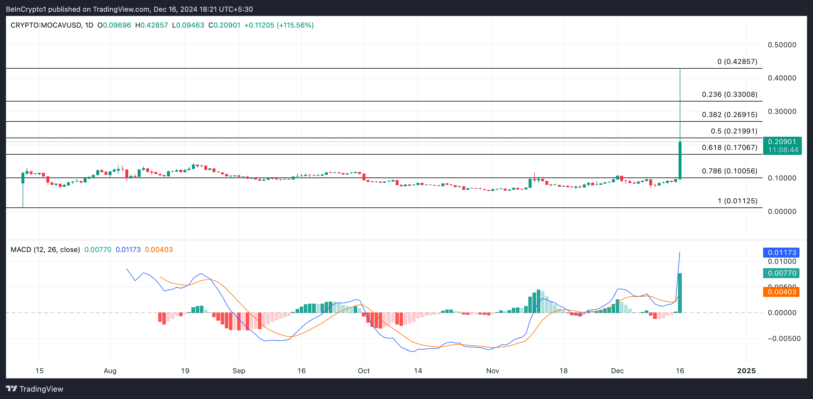 MOCA, tokenet fra Animoca Brands’ Mocaverse, nåede et nyt rekordhøjde på $0,42 i dag, før det oplevede et tilbagefald. Trods dette opretholder tokenet en bullish tendens.