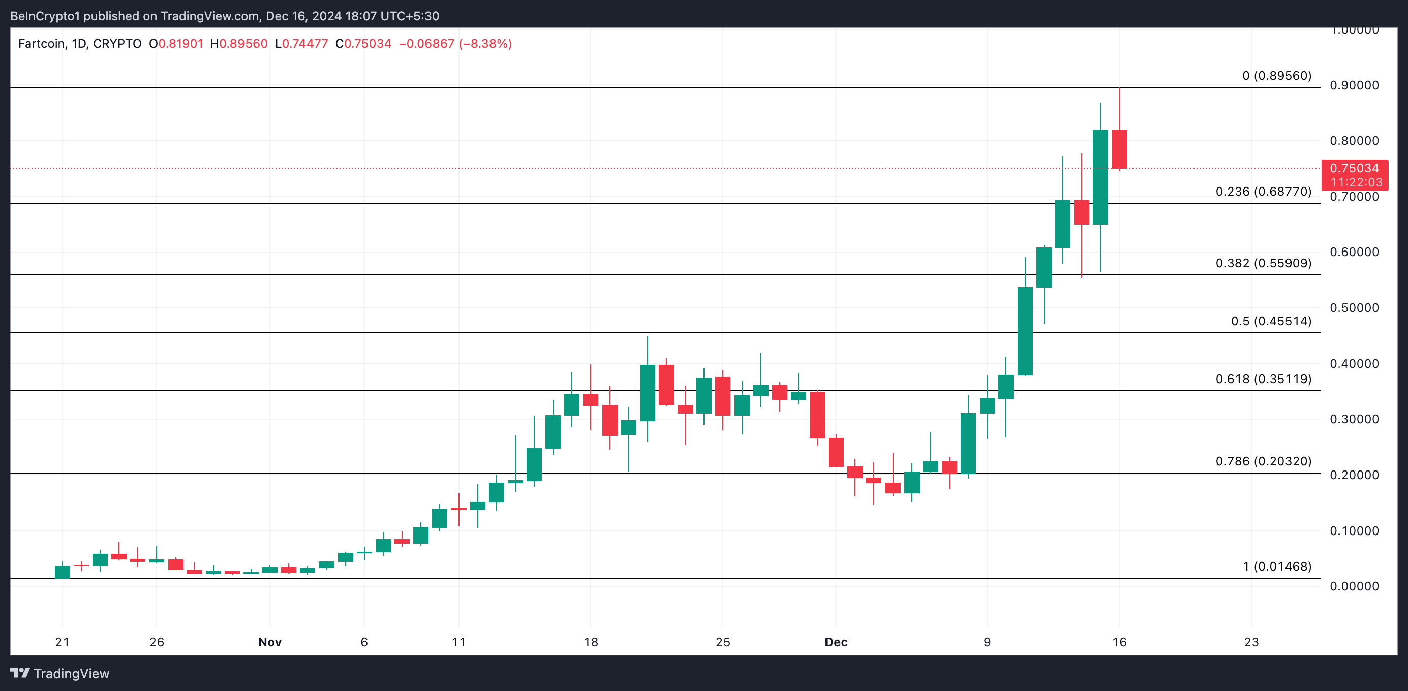Meme coinen FARTCOIN er en anden altcoin, der handlede til en rekordhøjde i dag. Tokenet blev kortvarigt handlet til en topkurs på $0,89, før det oplevede et tilbagefald. Det handles nu til $0,75, hvilket afspejler et fald på 16% fra sin top.