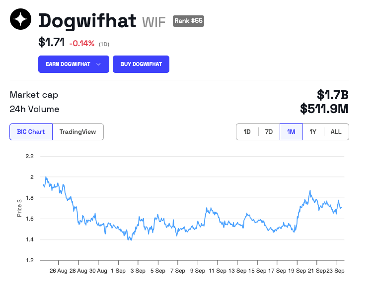 Øverst på hans liste er Dogwifhat (WIF), som i øjeblikket er den største meme coin på Solana blockchainen. Den har en markedsværdi på cirka $1,7 milliarder. Ansem forudsiger en ambitiøs fremtid for WIF med et mål om en markedsværdi på $100 milliarder.