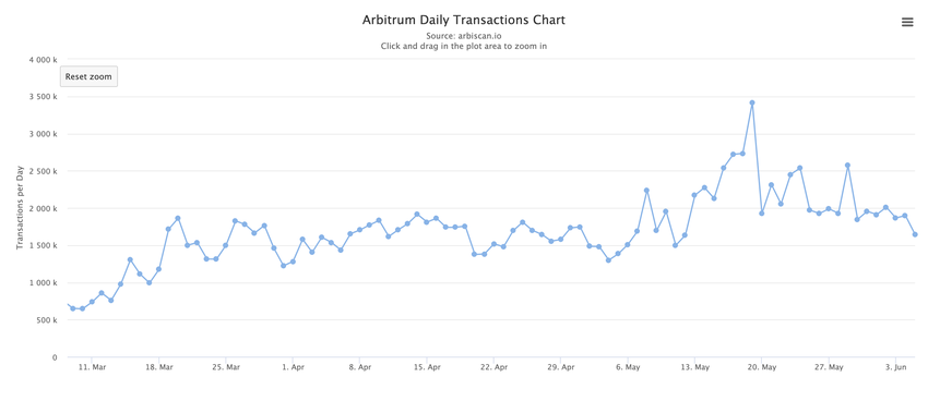 Diagrammet over Arbitrums daglige transaktioner viser en støt stigning i transaktioner fra midten af marts og toppede omkring midten af maj med over 3.500.000 daglige transaktioner. Selvom der er et lille fald efter toppen, er transaktionsmængden stadig høj, konsekvent over 1.000.000 pr. dag.