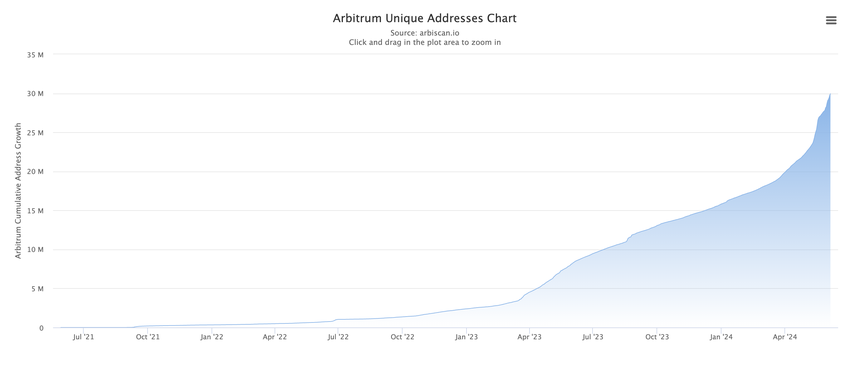 I juni 2024 har antallet af unikke adresser oversteget 30 millioner, hvilket indikerer en voksende brugerbase og øget anvendelse af Arbitrum-netværket.