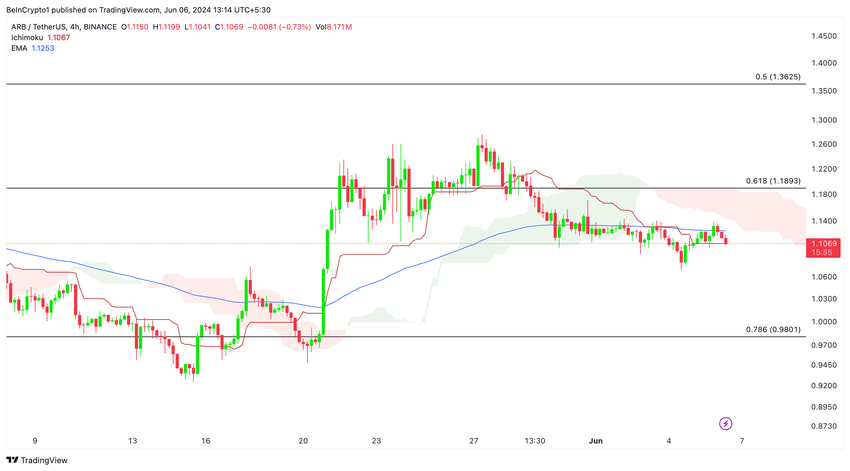 På det daglige diagram handles Arbitrums pris ved den nedre grænse af Ichimoku-skyen, hvilket indikerer en bearish stemning.