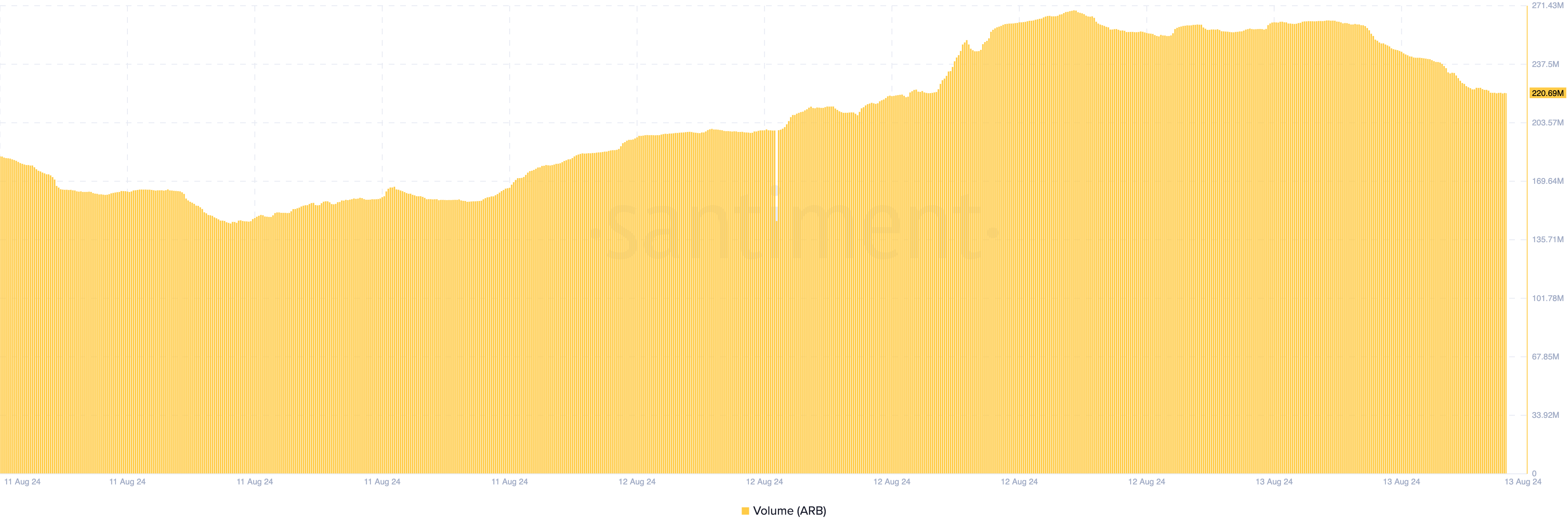 Data fra Santiment viste, at Arbitrums handelsvolumen var omkring $146 millioner den 11. august. I de tidlige timer den 13. august havde volumen oversteget $260 millioner før det seneste fald.
