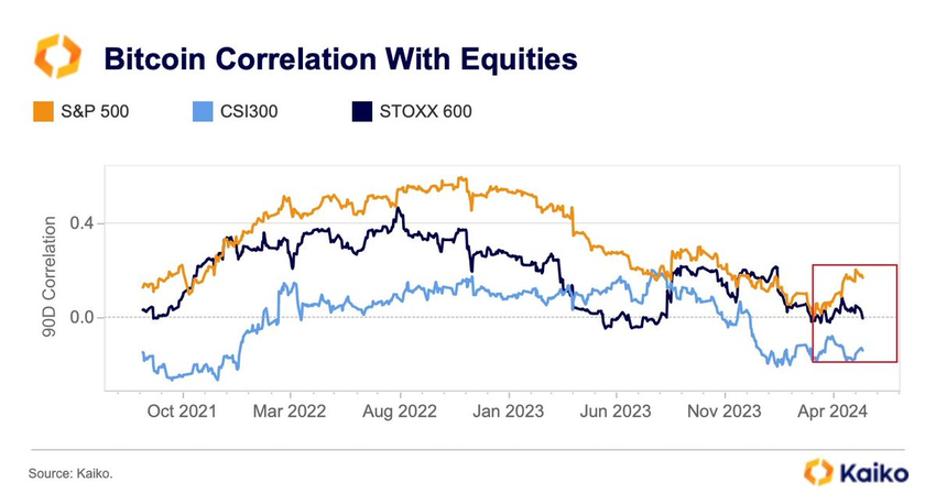 Korrelationen mellem Bitcoin og amerikanske aktier er fortsat et vigtigt mål at holde øje med. I sidste uge steg Bitcoins 90-dages korrelation med amerikanske aktier til 0,17 fra et flerårigt lavpunkt på 0,01 i marts. Denne udvikling understreger vigtigheden af aktiv overvågning og analyse i det nuværende markedsmiljø.