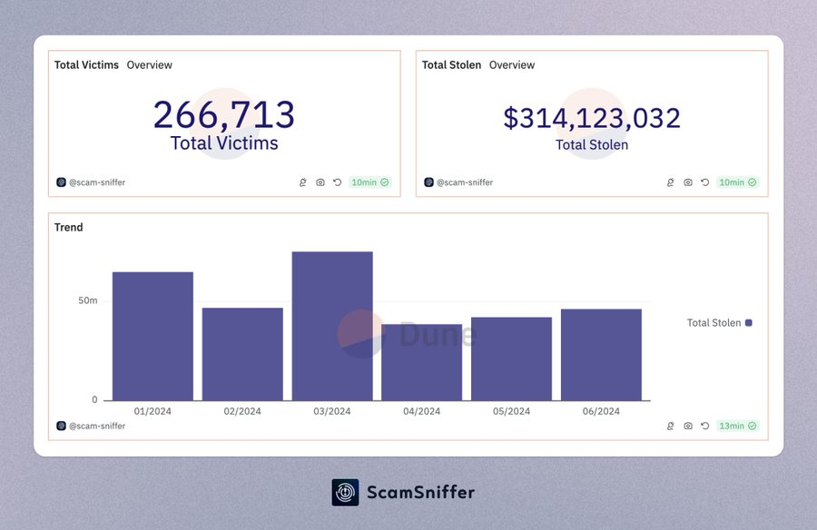 Eksperter har understreget, at phishing-svindel fortsat udgør en stor trussel i krypto-rummet. Disse angreb involverer at udgive sig for at være legitime enheder for at stjæle følsomme oplysninger og få adgang til ofrenes wallets. Scam Sniffer rapporterede, at over 260.000 personer mistede $314 millioner til phishing-svindel i første halvdel af dette år.