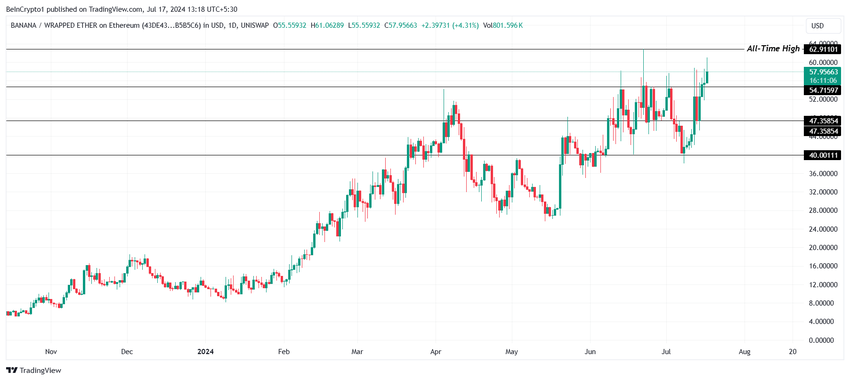 Telegram Coin Banana Gun (BANANA) nærmer sig at etablere en ny all-time high (ATH).