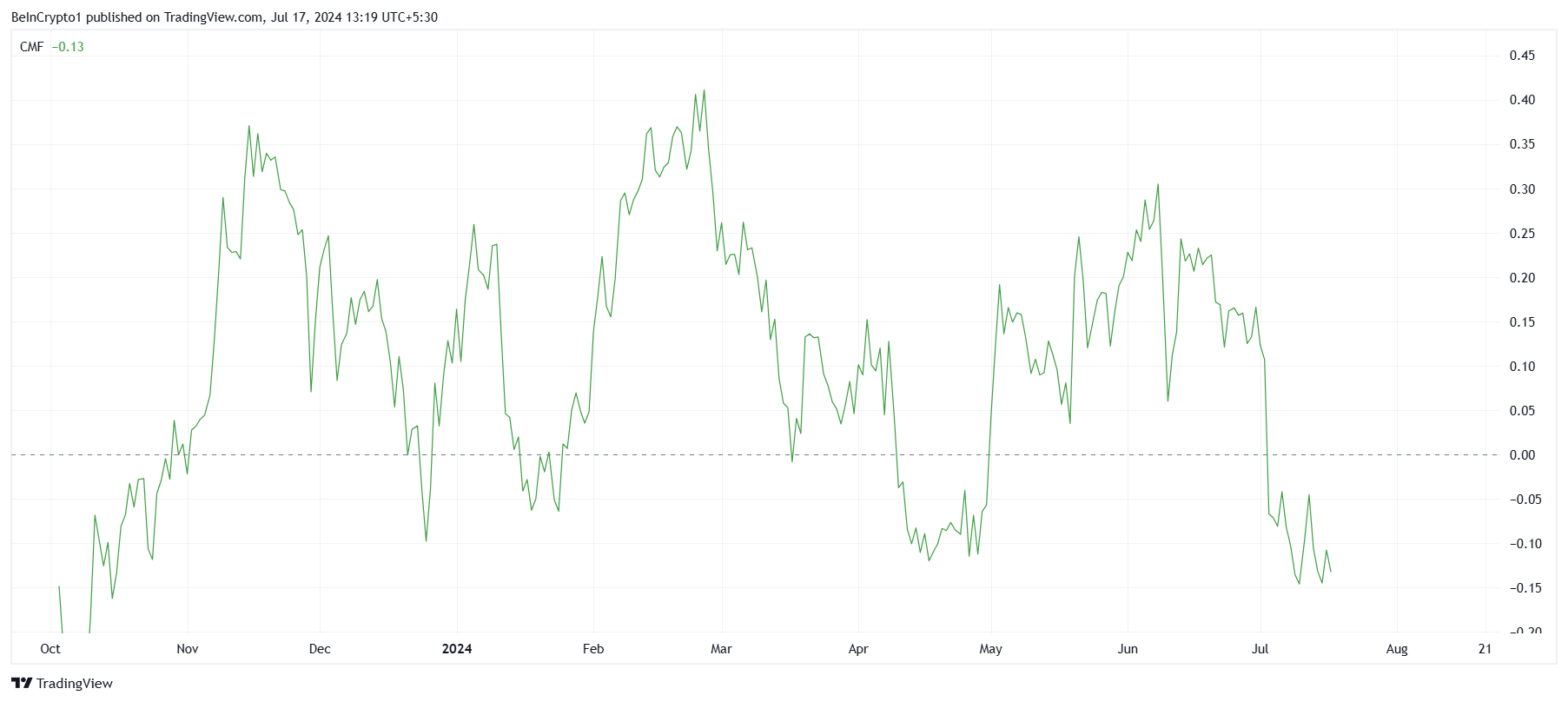 BANANAs pris oplever et opsving på grund af Chaikin Money Flow (CMF)-indikatoren, som viser en bemærkelsesværdig stigning i udstrømninger. Dette mønster tyder på, at på trods af det igangværende opsving, forlader væsentlig kapital markedet.