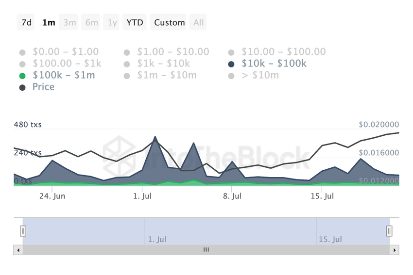 IntoTheBlocks data viser, at den seneste måned har oplevet en stigning i BEAMs daglige antal store transaktioner. Til sammenligning er det daglige antal BEAM-transaktioner mellem $10.000 og $100.000 steget med 57% i løbet af de sidste 30 dage. I samme periode er større transaktioner mellem $100.000 og $1.000.000 steget med 129%.