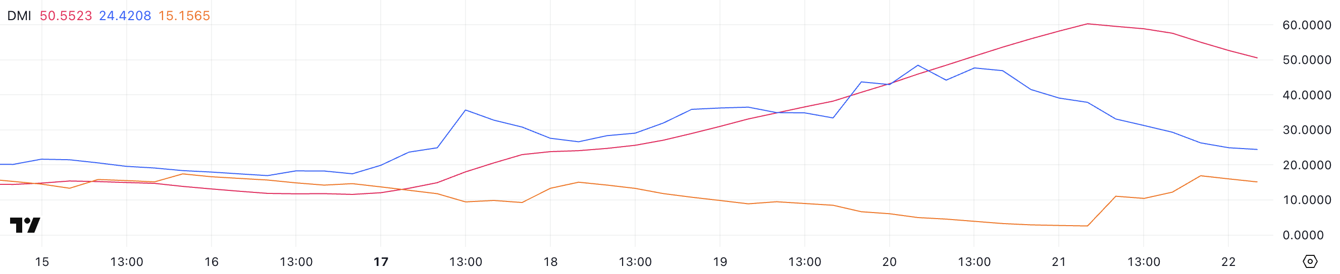Berachain Directional Movement Index (DMI) diagram viser, at dens Average Directional Index (ADX) i øjeblikket er på 50.5, efter at have toppet på 60.2 i går, op fra blot 13.3 for fem dage siden. ADX er en indikator, der bruges til at måle styrken af en trend, uanset dens retning, og spænder fra 0 til 100.