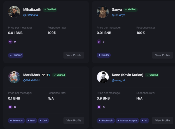 Over 100 Key Opinion Leaders (KOLs) har tilsluttet sig platformen og sat deres beskedpriser mellem 0,01 til 0,2 BNB. At passere som en måde at finansiere innovation fremmer også en ny vej for monetiseret kommunikation inden for kryptosamfundet.