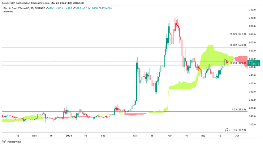 Bitcoin Cash(BCH) handles i øjeblikket til 507$ inde i den daglige Ichimoku-sky. Hvis man forlader den daglige Ichimoku-sky i nedadgående retning, kan det vende den bearish trend.