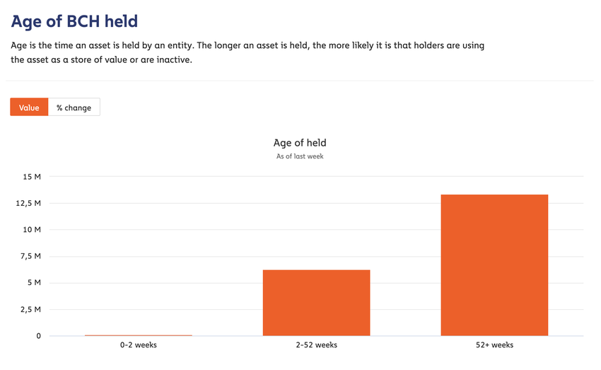 Omkring 6 millioner BCH holdes i 2-52 uger, hvilket indikerer mellemlangsigtede ejere, som måske venter på yderligere prisstigninger, før de overvejer at sælge.