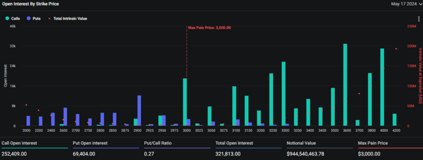 Ud over Bitcoin-optioner udløber 321.925 Ethereum-kontrakter i dag. Disse udløbende kontrakter har en nominel værdi på over 940 millioner dollars med et put-to-call-forhold på 0,27 og et smertepunkt på 3.000 dollars.