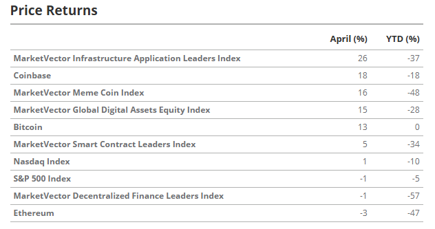 MarketVector Smart Contract Leaders Index faldt 5% i april og er nede med 34% år-til-dato. Solana skilte sig ud som en sjælden vinder, med en stigning på 16% takket være netværksopgraderinger og stigende institutionel interesse i treasury.