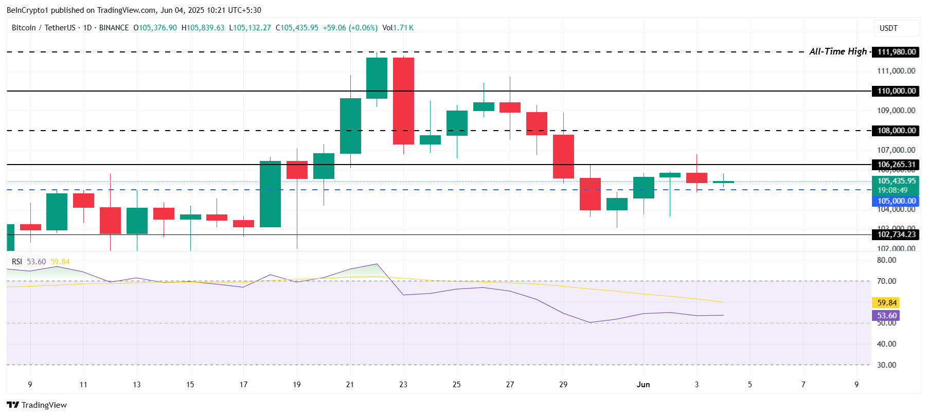 Bitcoins kurs er i øjeblikket $105,435, og holder sig over støtten på $105,000. Men kryptokongen står over for et modstandsniveau på $106,265. Trods dette forbliver Relative Strength Index (RSI) over det neutrale niveau på 50,0, hvilket indikerer, at det bullish momentum stadig er intakt.