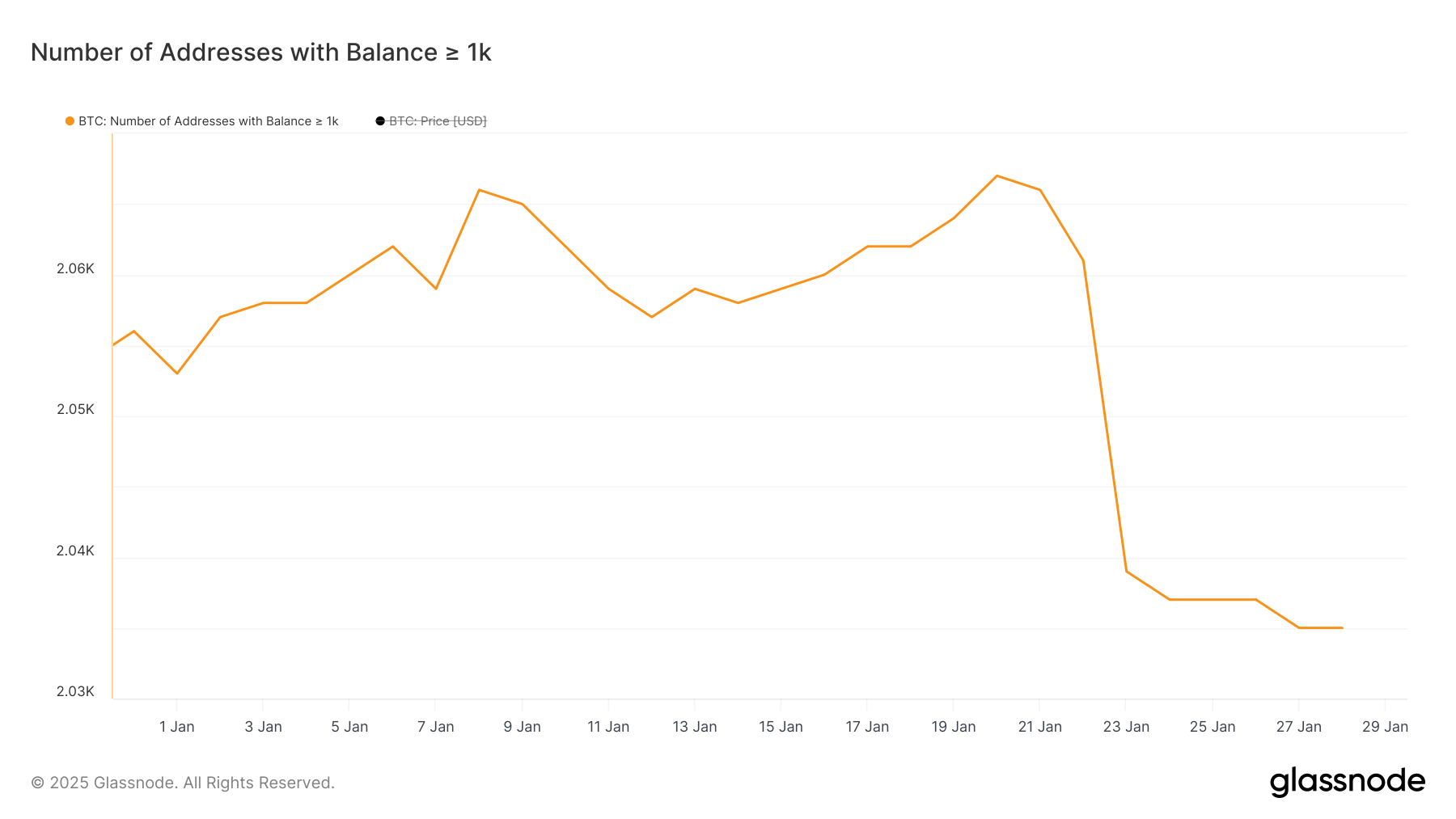 Antallet af BTC-hvaler — adresser, der holder mindst 1.000 BTC — er faldet til 2.035, det laveste niveau siden januar 2024. Et markant fald skete mellem 20. januar og 24. januar, da antallet faldt fra 2.067 til 2.037.