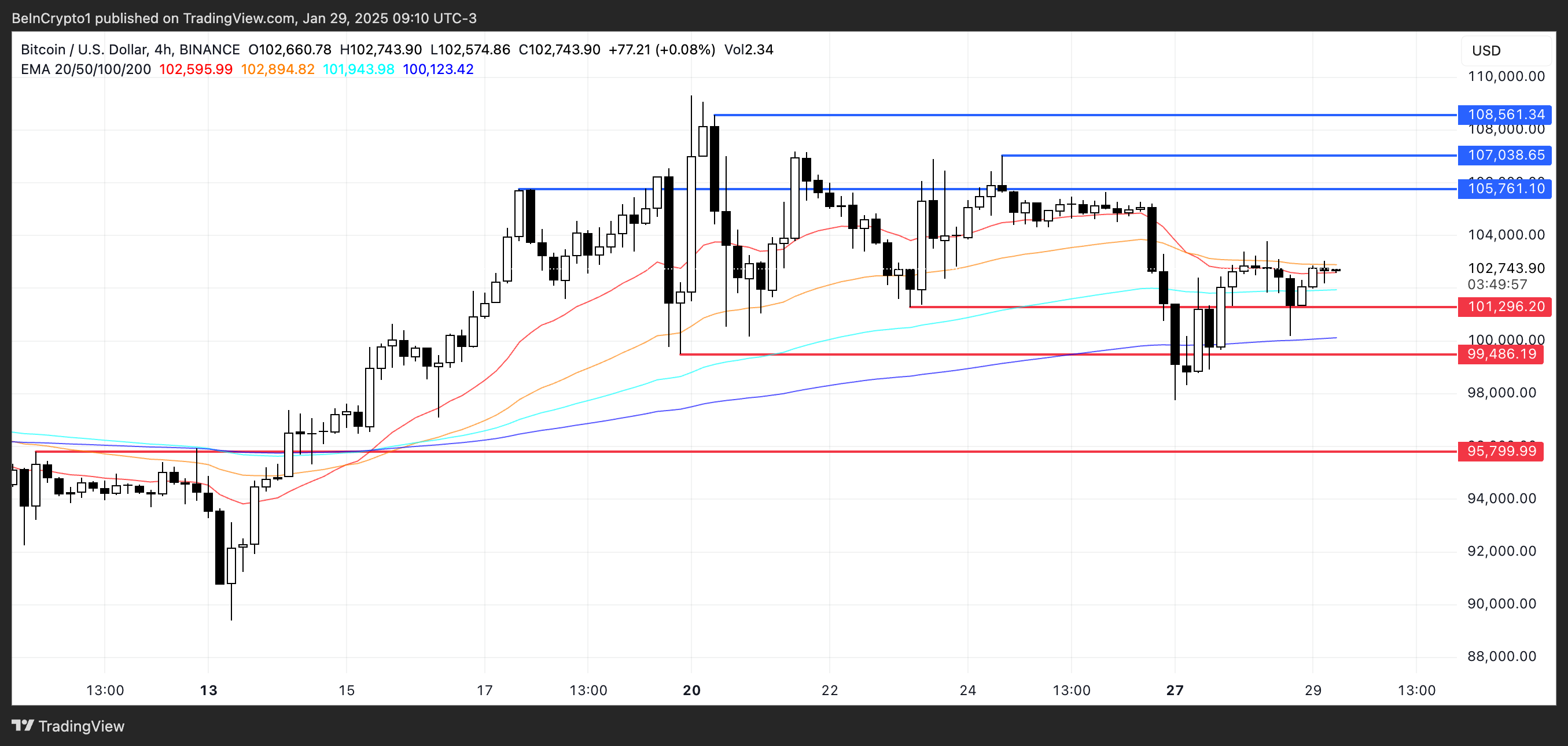 Bitcoins EMA-linjer indikerer en konsolideringsfase, da de handler tæt sammen. Det nuværende støtteniveau er omkring $101.300, som indtil videre er blevet holdt.