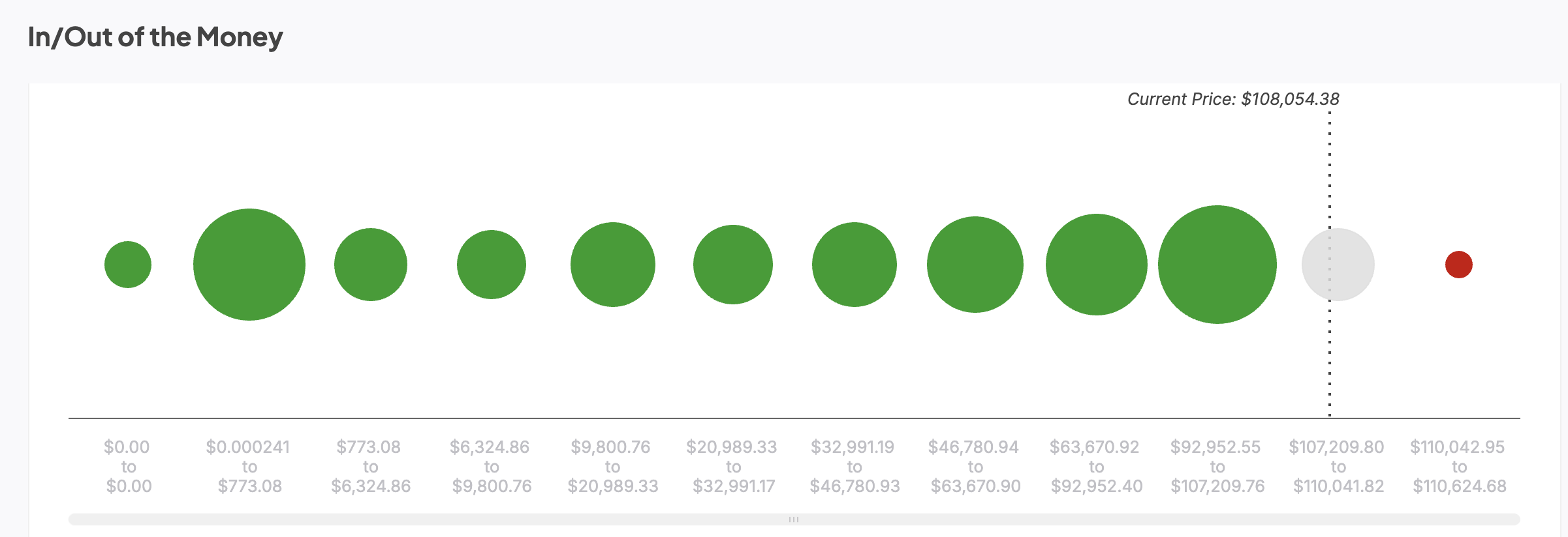 In/Out of the Money Around Price (IOMAP) indikatoren kortlægger wallet-adresser, der har købt Bitcoin på forskellige kursniveauer, og viser, hvor det største køb- og salgspres kan opstå. Klynger af wallets “in the money” (i øjeblikket i profit) danner støttenzoner, mens de “out of the money” (i øjeblikket med tab) danner modstand.