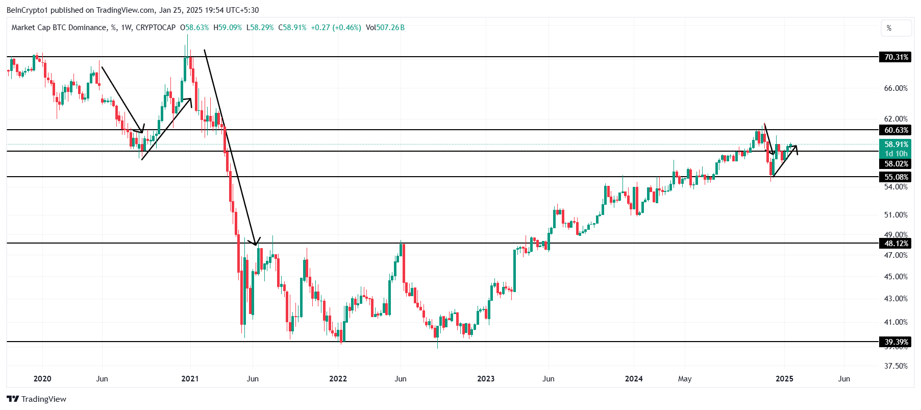 Bitcoins dominans på kryptovalutamarkedet følger et 4-årigt mønster, der giver indsigt i dets makro momentum. Efter at have bundet ud på 54% i december 2024, er Bitcoin-dominansen steget til over 57% i januar 2025. Dette mønster spejler 2020-cyklussen, hvor dominansen bundede ud på 60% i november 2020 og steg til 69% i januar 2021.