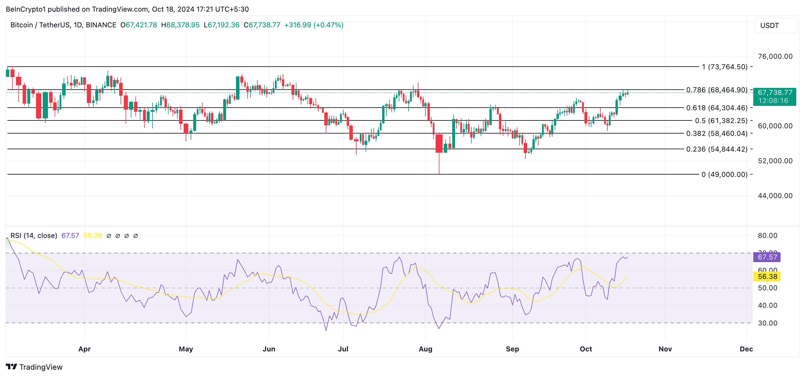 Bitcoin handles i øjeblikket til $67,738, lige under modstandsniveauet på $68,464. De seneste dage har mønten oplevet en stigning i efterspørgslen. Dette afspejles i dens stigende Relative Strength Index (RSI), som i øjeblikket er på 67,57.