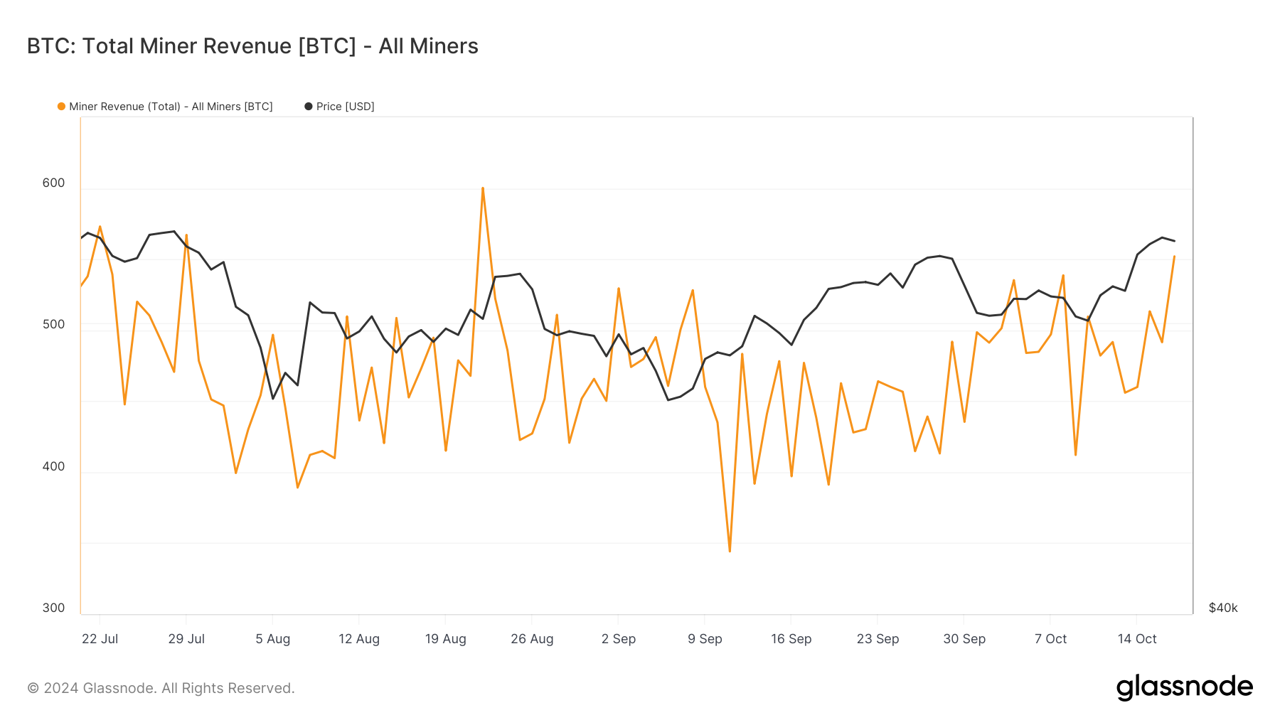 I går udgjorde minernes indtægter på Bitcoin-netværket i alt 552 BTC, værdisat til over $37 millioner til nuværende markedspriser. Ifølge Glassnodes data markerede dette det højeste siden 22. august og repræsenterede en stigning på 12% fra de 491 BTC, der blev registreret i samlede indtægter onsdag.