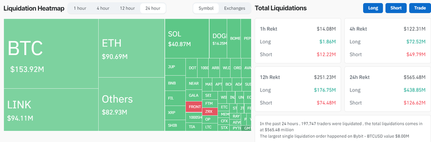 Ifølge data fra CoinGlass oplevede prisspekulanter et samlet tab på 565 millioner dollars i denne periode. Long traders måtte bære byrden ved at miste 438 millioner dollars, mens short traders måtte afvikle 126 millioner dollars.