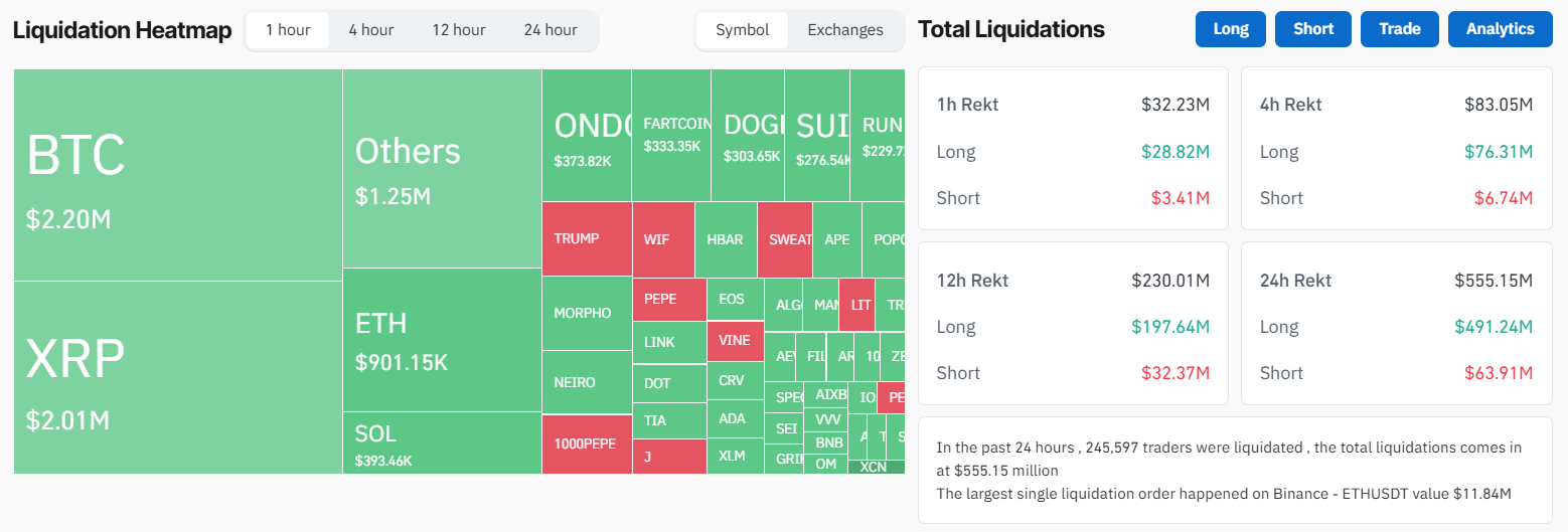Den øgede volatilitet udløste en afviklingsbølge, der slettede over $555 millioner i gearede positioner, ifølge CoinGlass. Mere end 239.000 handlende stod over for tvangsafviklinger, hvor long-handlende — dem der satser på kursstigninger—led de største tab, svarende til $491 millioner.