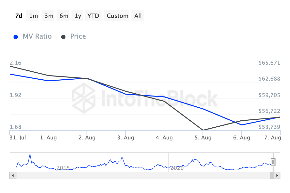 Historisk set fortæller denne måling også, hvornår Bitcoin er undervurderet, overvurderet og tæt på dens top i cyklussen. I øjeblikket viser data fra IntoTheBlock, at MVRV-forholdet er 1,76.