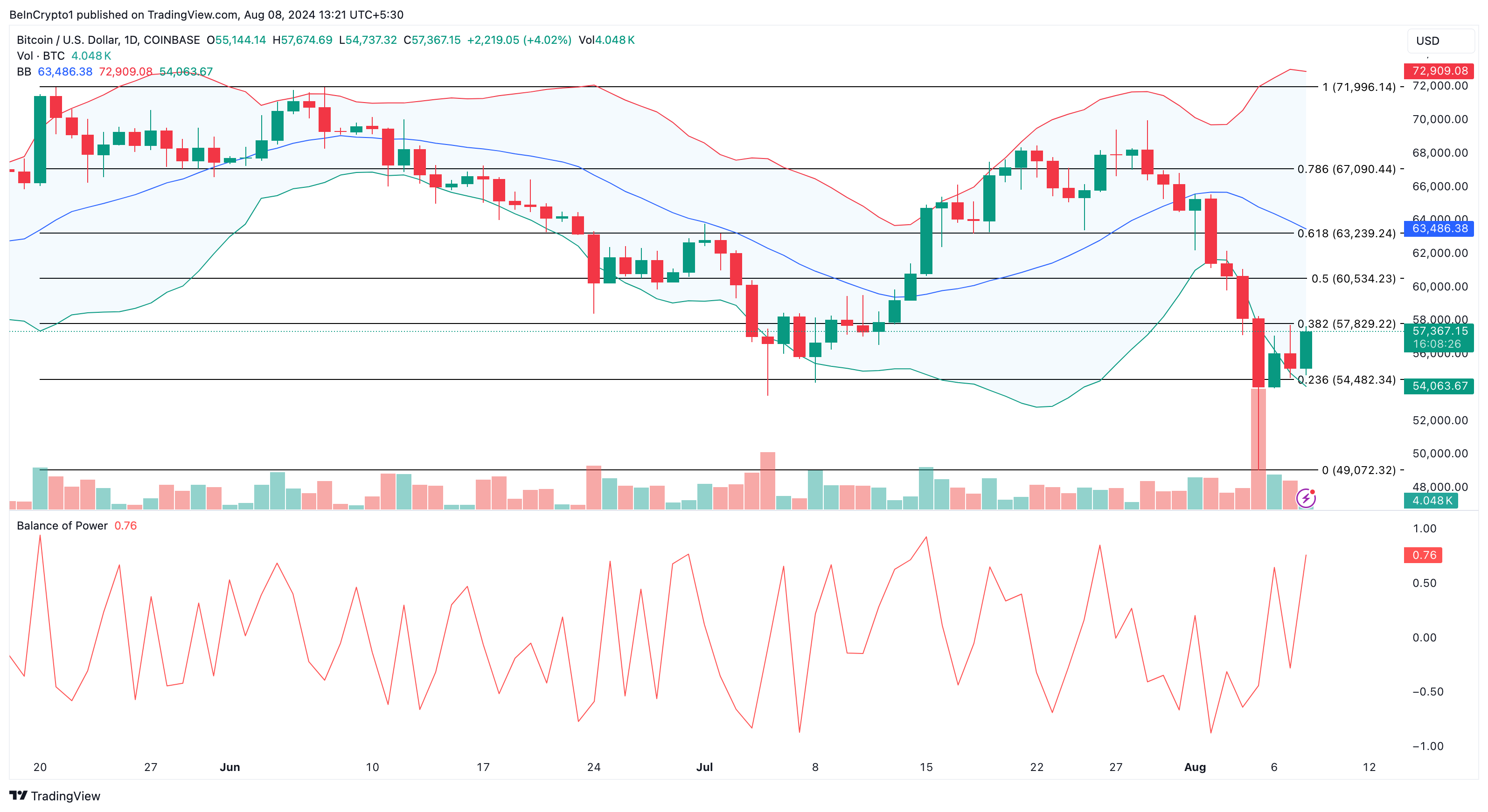 Når indikatorens øvre bånd rammer prisen, er den overkøbt. Men når den rører det nedre bånd, er den oversolgt. Billedet nedenfor viser, at BTC var oversolgt den 7. august, da kursen var $54,594.